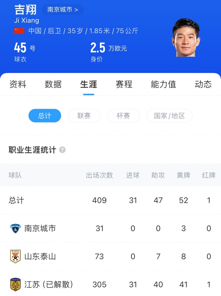 吉翔现年35岁,现效力于中甲南京城市,本赛季共出场15次。